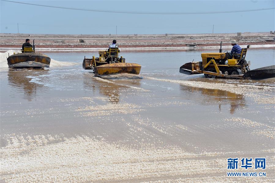 5月20日,无棣县鲁北盐场工人在机械化收盐。