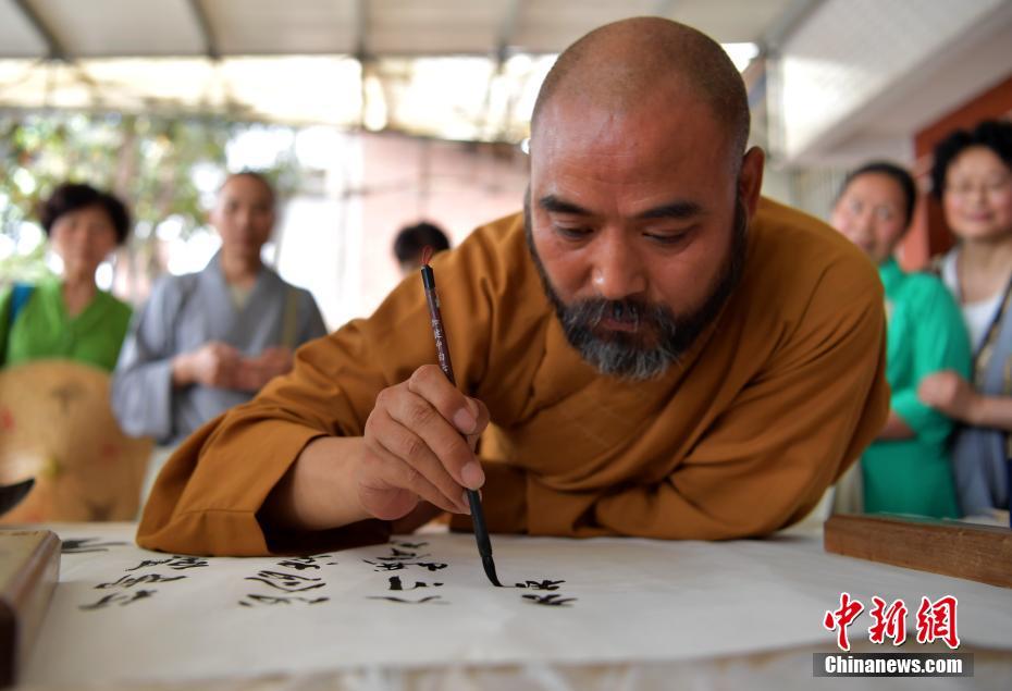 休息之余静安寺方丈慧明大和尚写下此次行脚感受。 中新社记者刘忠俊 摄