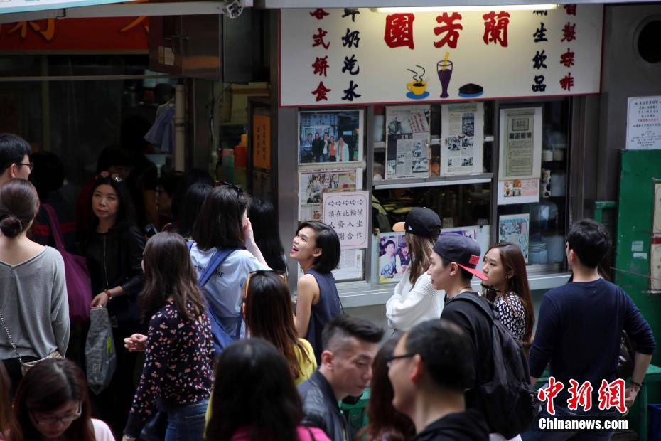 内地游客在香港中环老字号“兰芳园”排队品尝地道“丝袜奶茶”。近日,香港推出“旧城中环”活动,重新包装中环幷打造成时尚生活景点,鼓励游客深度游,感受香港古色古香的一面。中新社记者 洪少葵 摄