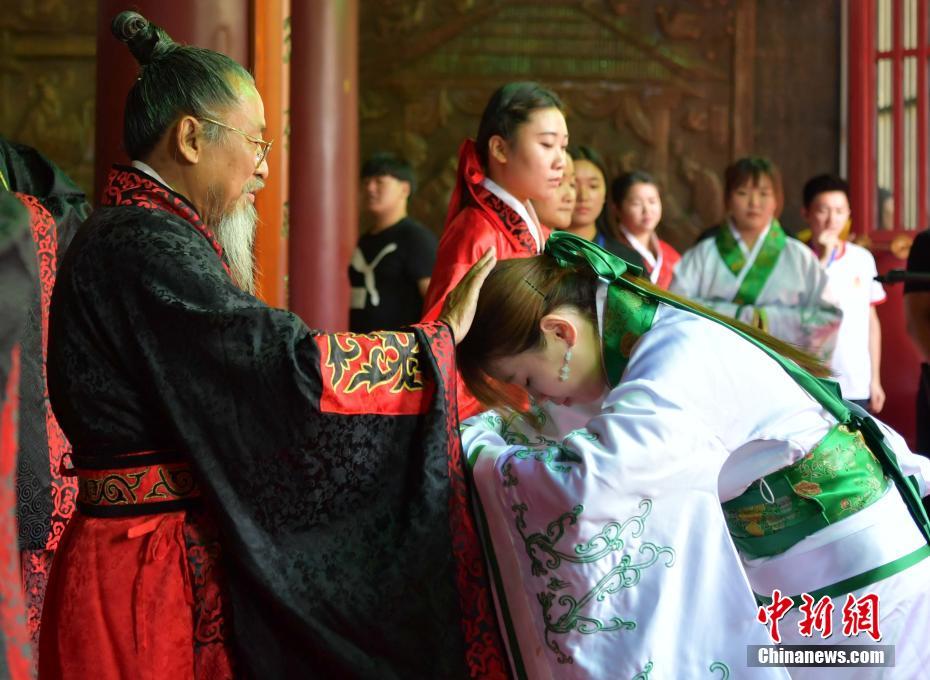 6月12日,河北美术学院在该学院文庙为1329名毕业生举行“汉式”学士学位授予仪式。仪式现场,身着汉服的毕业生依次入殿,受“灌顶”、“扫浮尘”、“净水”之礼,体验中国传统文化魅力,开启人生新里程。图为甄忠义校长依次为毕业生“灌顶”。
