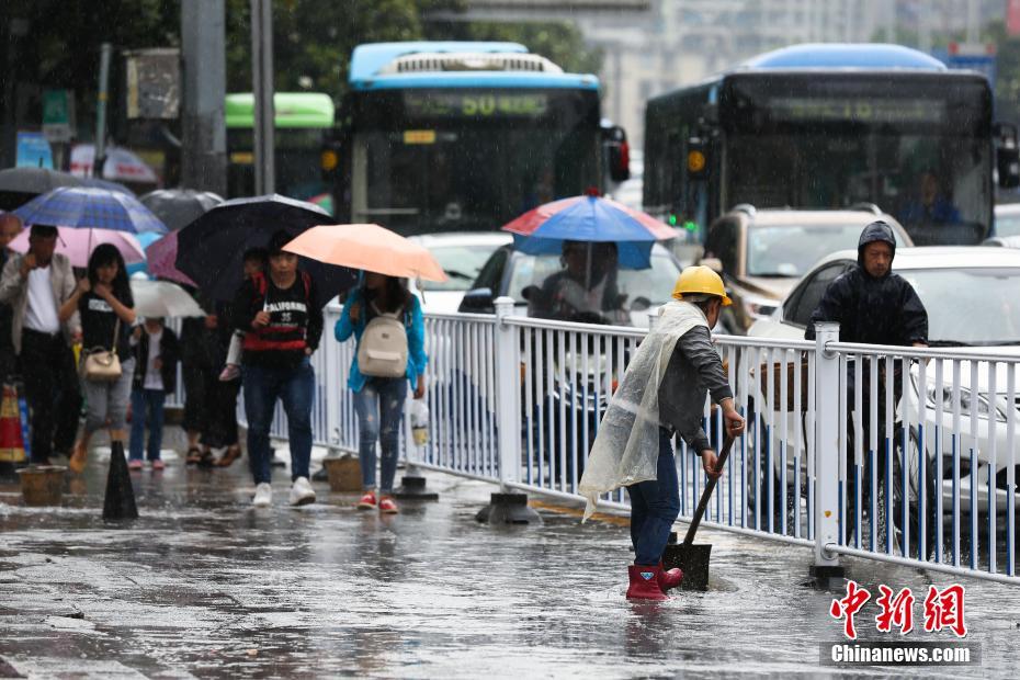 6月12日,贵阳市气象台于6时28分将暴雨黄色预警信号升级为暴雨红色预警信号,持续降雨造成贵阳市多处路段严重积水,市民出行受阻,相关部门全力疏通,保障市民的出行安全。图为贵阳市环卫工人清理路面积水。黄芷昕 摄