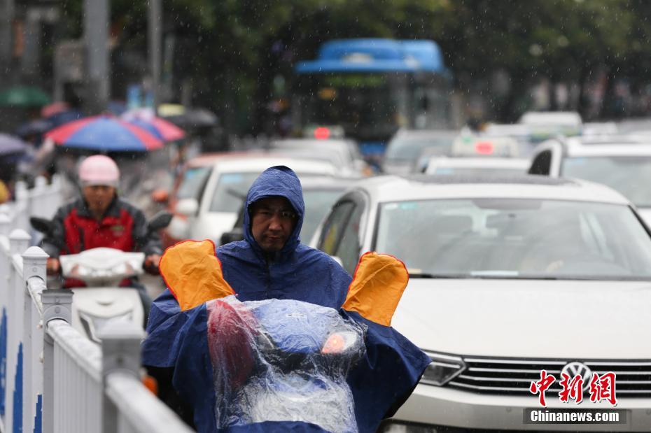 贵阳市民骑摩托车雨中出行。 黄芷昕 摄