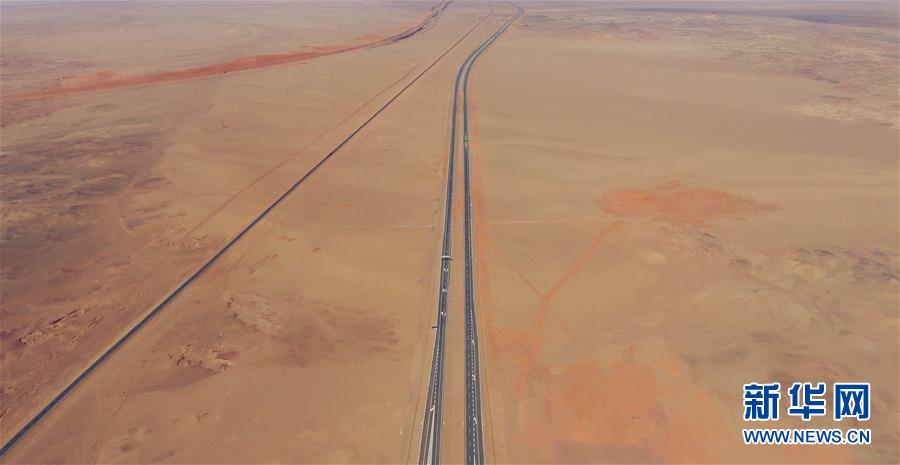 戈壁的大漠黄沙曾掩埋了无数西域古道,而如今一条大漠天路正顽强地与黄沙“搏斗”,在乌兰布和、腾格里、巴丹吉林三大沙漠中穿行,成为世界上最长的穿越沙漠高速公路,这就是北京至乌鲁木齐的京新高速公路。京新高速全长2540公里,建成后北京到新疆的行车里程将缩短1300公里,大漠变通途,通疆达海的梦想即将实现。新华社记者邓华 摄
