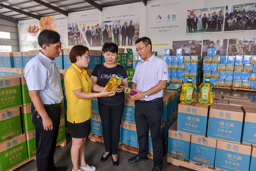在美临库房,董事长杜美芹陪同邯郸市工商联副主席孟力听员工讲解食用油的营养成分、功效,质量标准。让广大家庭吃上健康油、放心油,严把质量关,一直以来是美临公司始终坚持的“诚信”原则。(图文/达明)