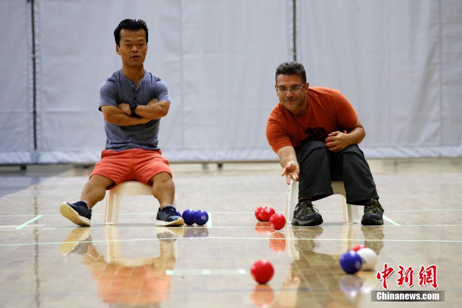 两名运动员在比赛间歇进行室内硬地滚球练习。