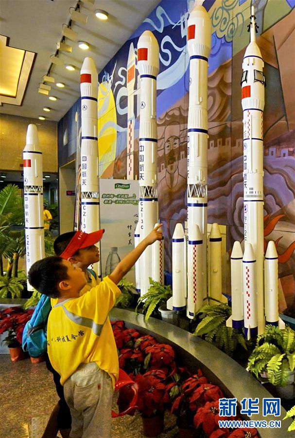 8月10日,学生们在中华航天博物馆内观看运载火箭模型。