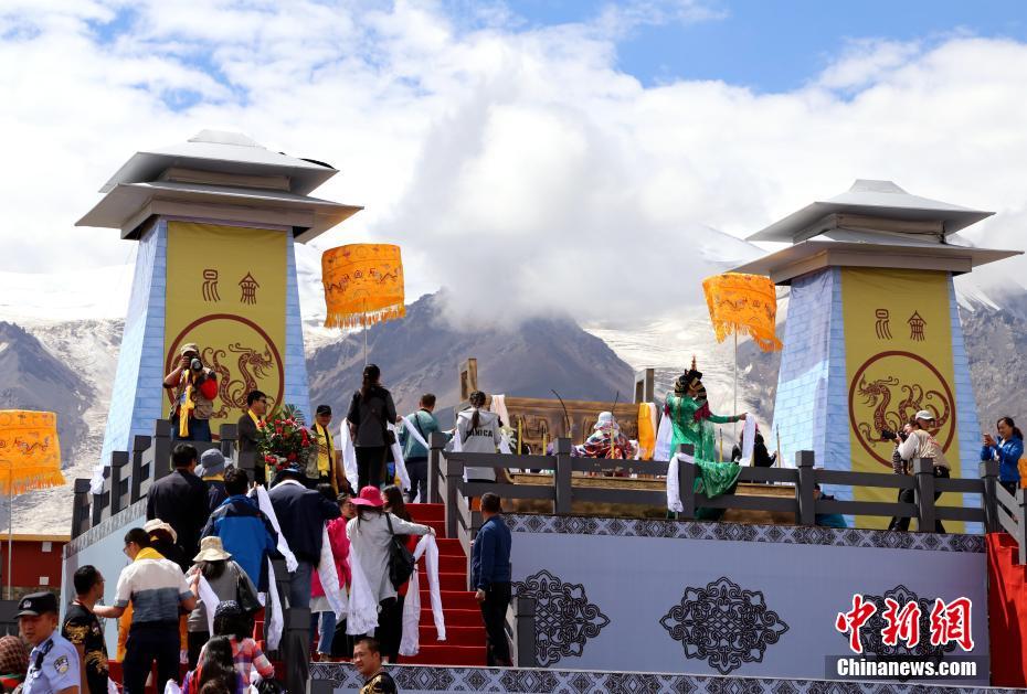 8月16日,“2017中国青海昆仑山敬拜大典”在海拔4300米的玉珠峰脚下举行,来自北京、四川、浙江等地的200多位专家学者共同见证了这一盛况。图为手持哈达的民众走上祭拜台祭拜昆仑山。中新社记者孙睿 摄