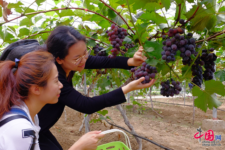 在北京绿思维庄园里,游客们喜摘葡萄。