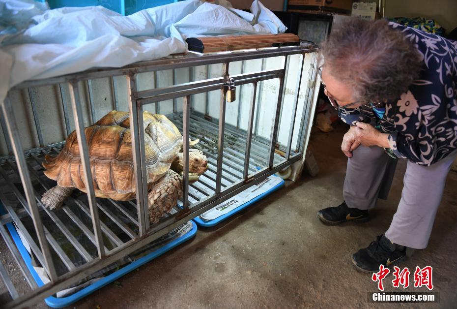 9月7日,长春市民郝玉兰将自己饲养十年的乌龟“苏苏”带出笼子晒太阳。今年83岁的郝玉兰十年前去云南旅游的时候买了一只不足半斤重的小乌龟,并起名叫“苏苏”。十年时间这只乌龟已长到百余斤,每天郝玉兰都会带着乌龟出门晒太阳,邻居称她为“乌龟奶奶”。中新社记者 张瑶 摄