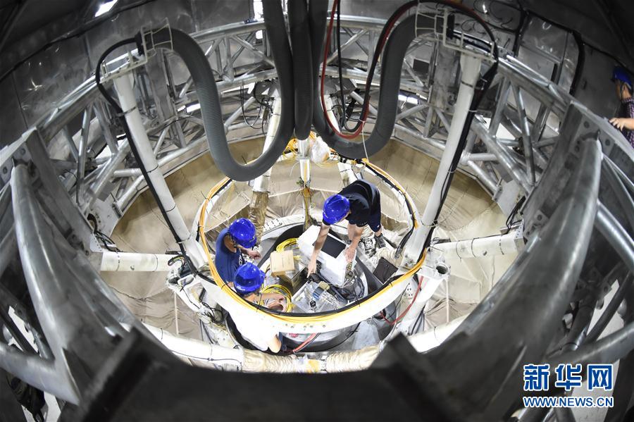 工作人员在FAST馈源舱内工作(8月10日摄)。