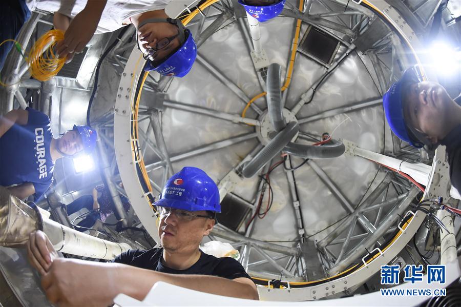 工作人员在FAST馈源舱内工作(8月10日摄)。
