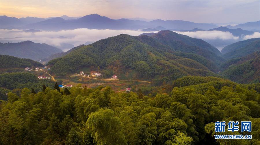 11月2日拍摄的霍山竹海与农舍。地处大别山腹地的安徽省霍山县拥有毛竹生长繁育得天独厚的自然条件,全县竹林面积达3万公顷,立竹量8000万株。竹产业成为县域经济发展的“绿色银行”,漫山遍野的竹海与时常涌现的壮观云海吸引众多的游客前来观光。新华社记者陶明 摄