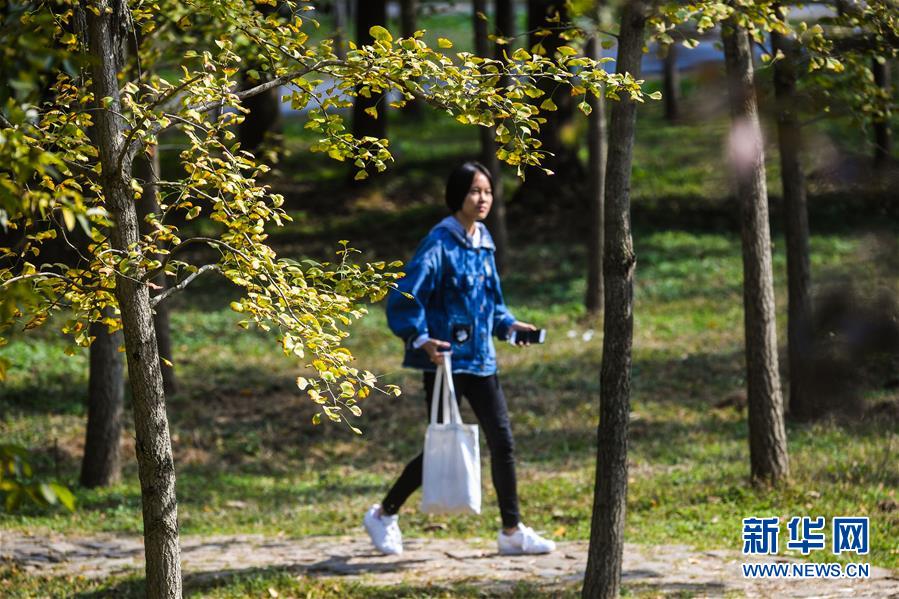 11月4日,游客在“十里古银杏长廊”的银杏林中游玩。新华社记者徐昱摄