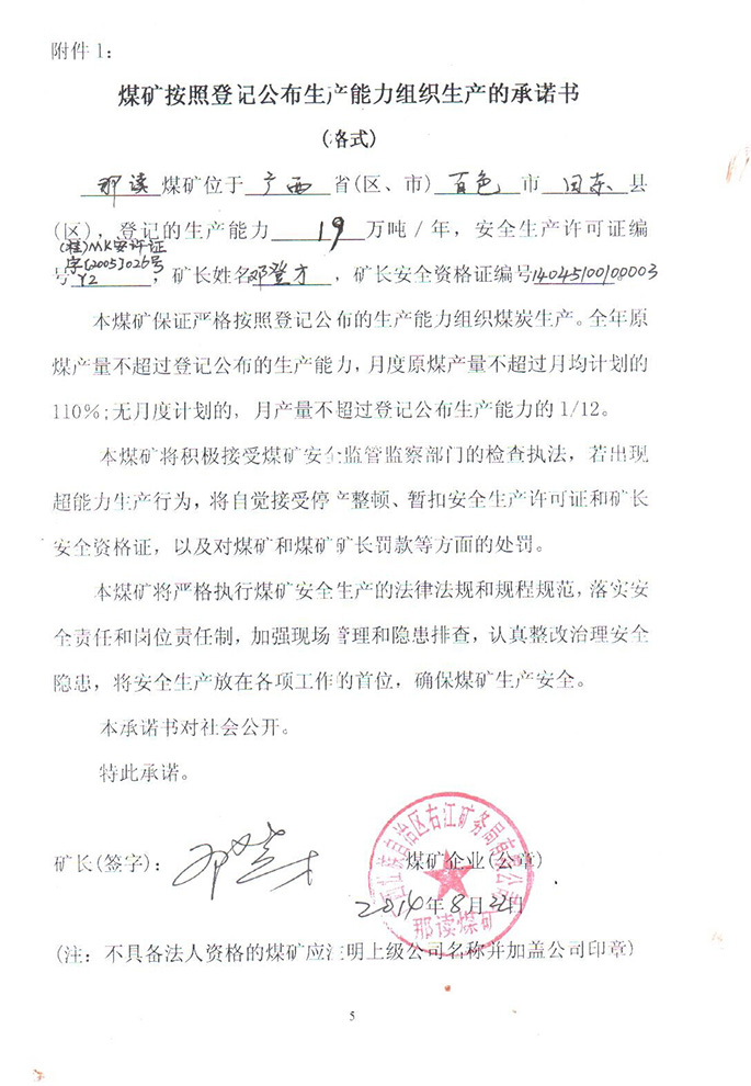 那读煤矿生产承诺书