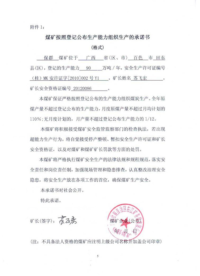 保群煤矿生产承诺书