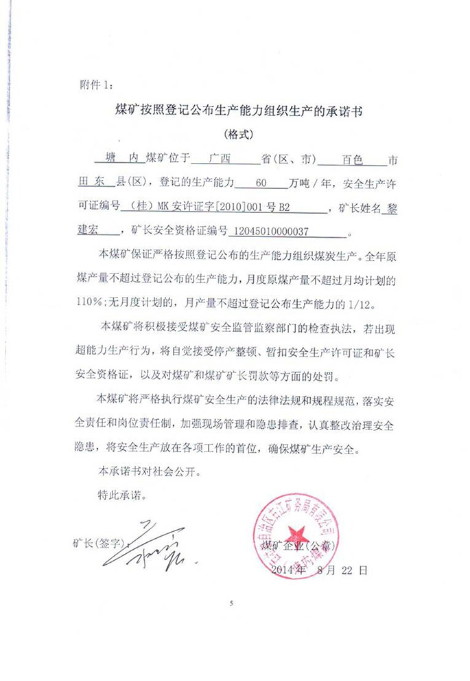 塘内煤矿生产承诺书