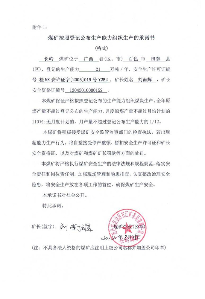 长岭煤矿生产承诺书