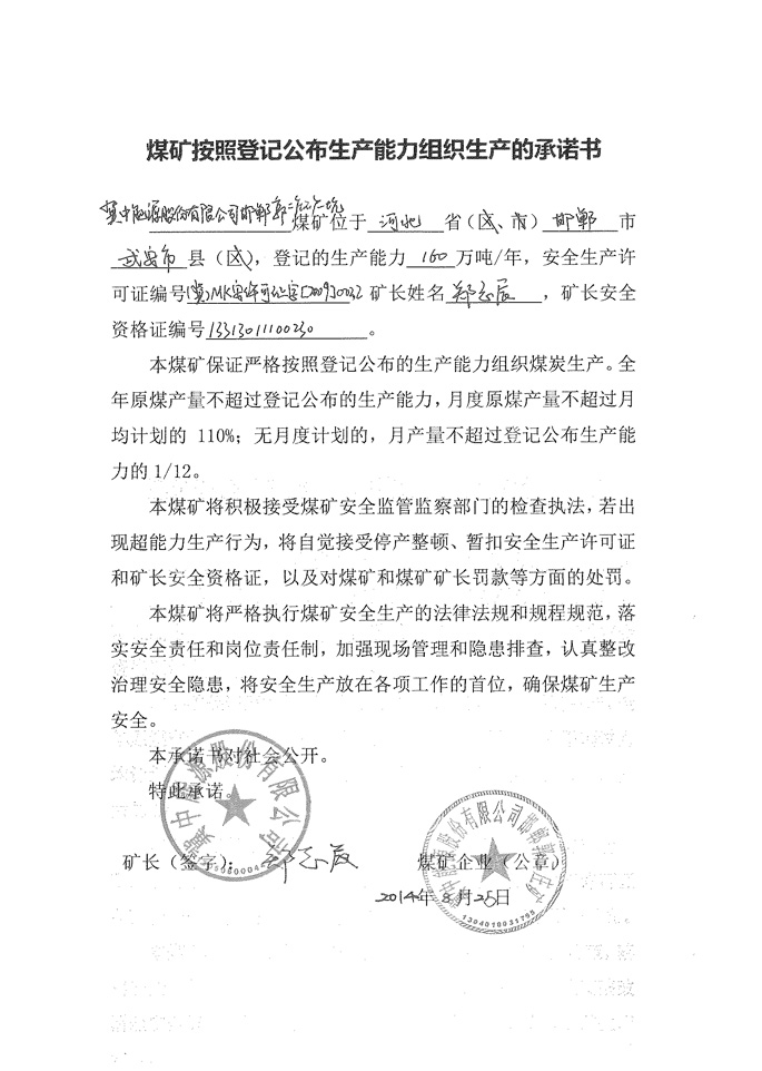 冀中能源邯郸矿业集团有限公司郭二庄煤矿生产承诺书