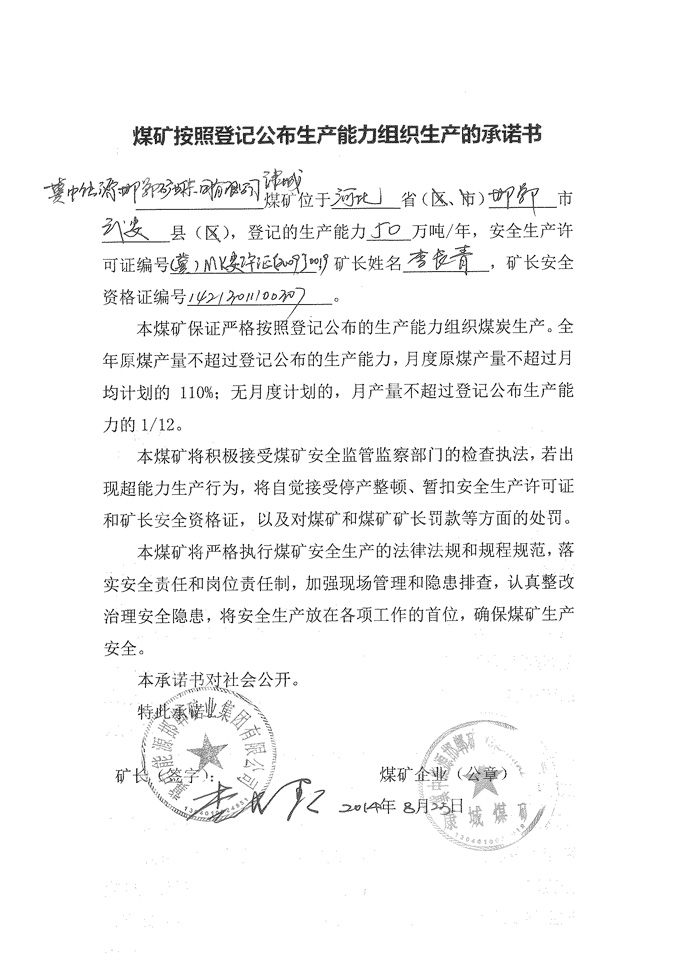 冀中能源邯郸矿业集团有限公司康城煤矿生产承诺书