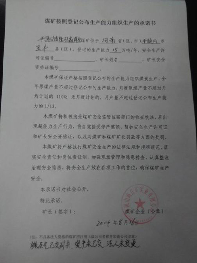 平顶山裕隆泓鑫煤业有限公司生产承诺书