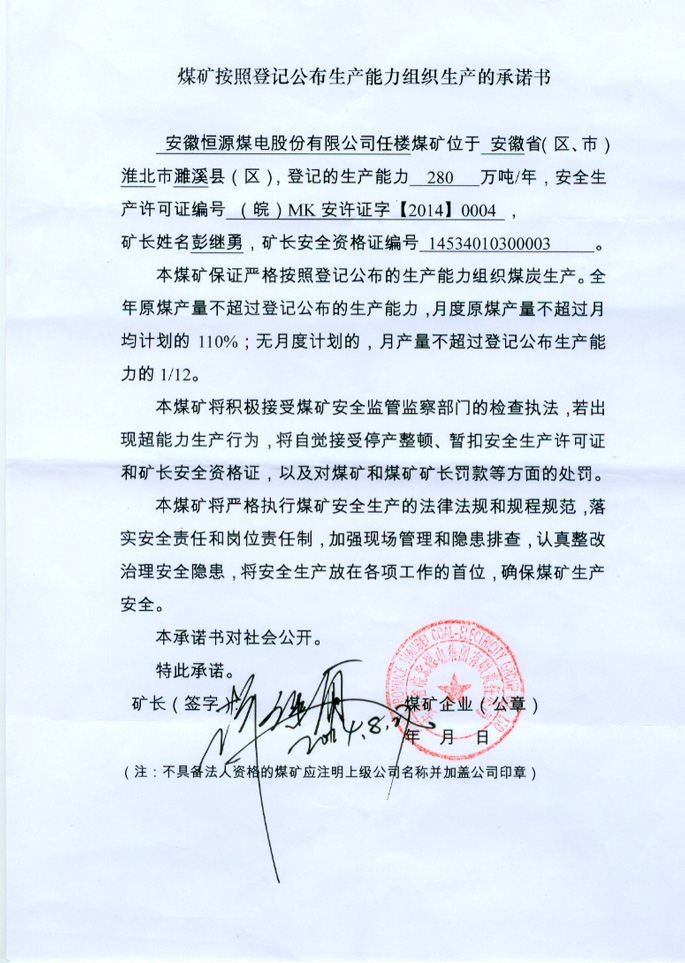 安徽恒源煤电股份有限公司任楼煤矿生产承诺书