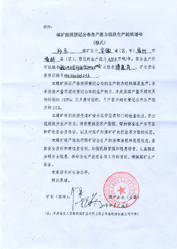 安徽恒源煤电股份有限公司祁东煤矿生产承诺书