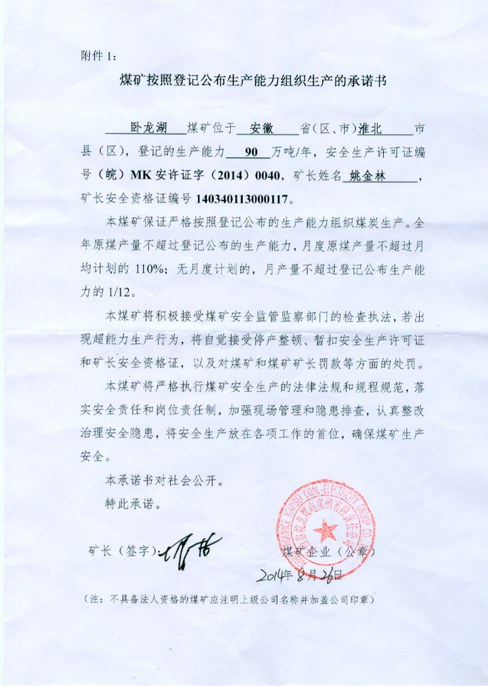 安徽恒源煤电股份有限公司卧龙湖煤矿生产承诺书