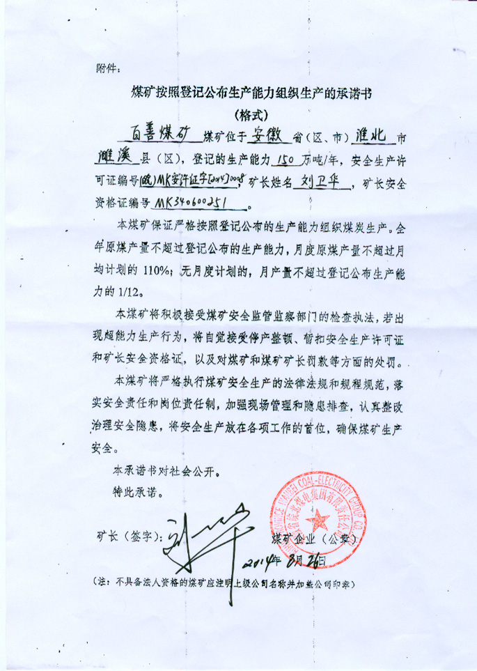 皖北煤电集团有限责任公司百善煤矿生产承诺书