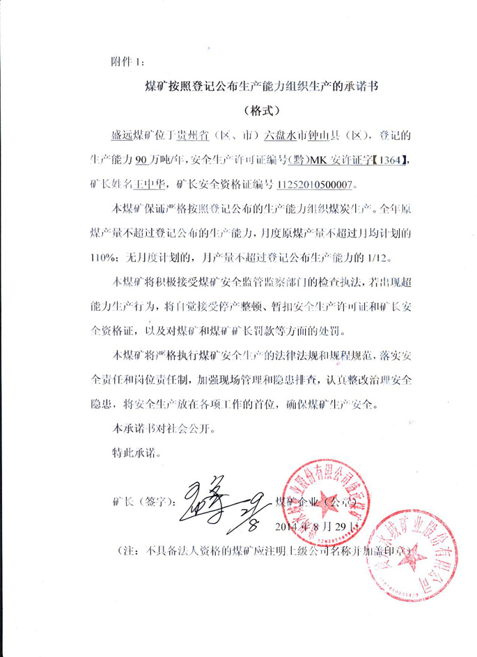 贵州水城煤电有限责任公司盛远煤矿生产承诺书