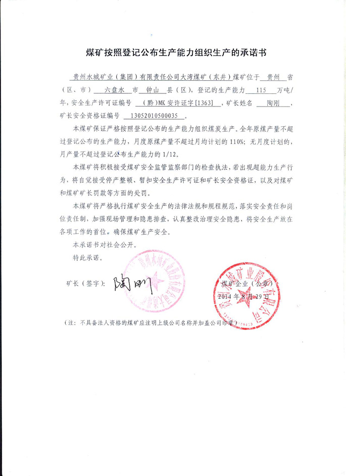 贵州水城矿业(集团)有限责任公司大湾煤矿生产承诺书
