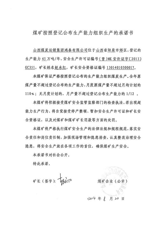 山西煤炭运销集团鸿泰煤业有限公司生产承诺书