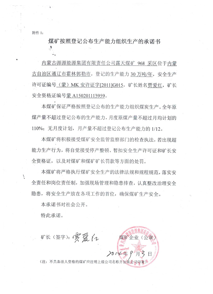 内蒙古源源能源集团有限责任公司露天煤矿968采区生产承诺书