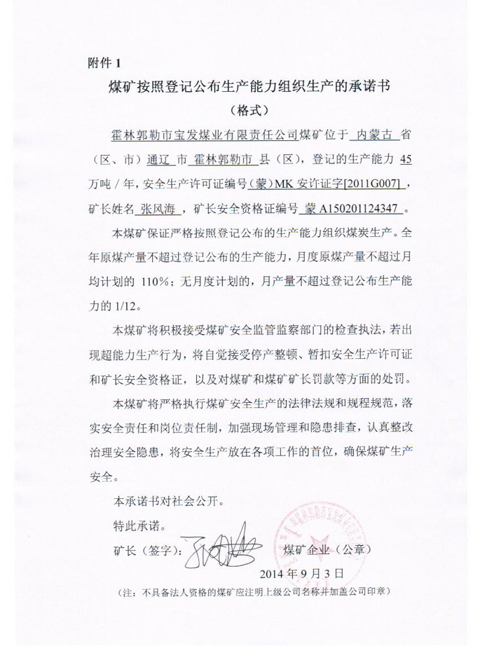 霍林郭勒市宝发煤业有限责任公司生产承诺书