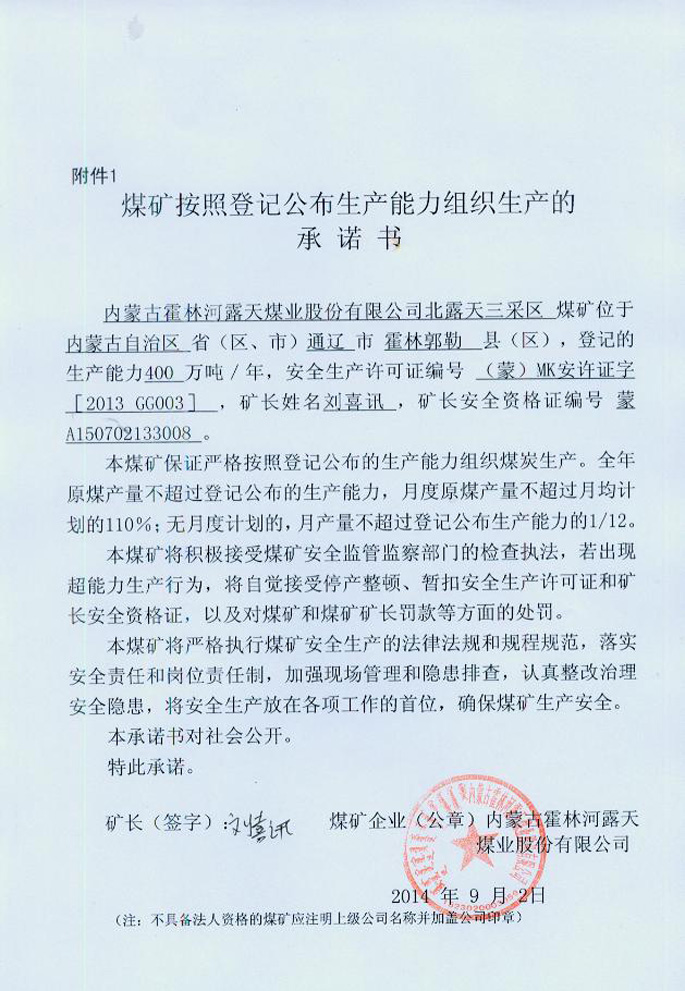 内蒙古霍林河露天煤业股份有限公司一号露天矿(北露天三采区)生产承诺书