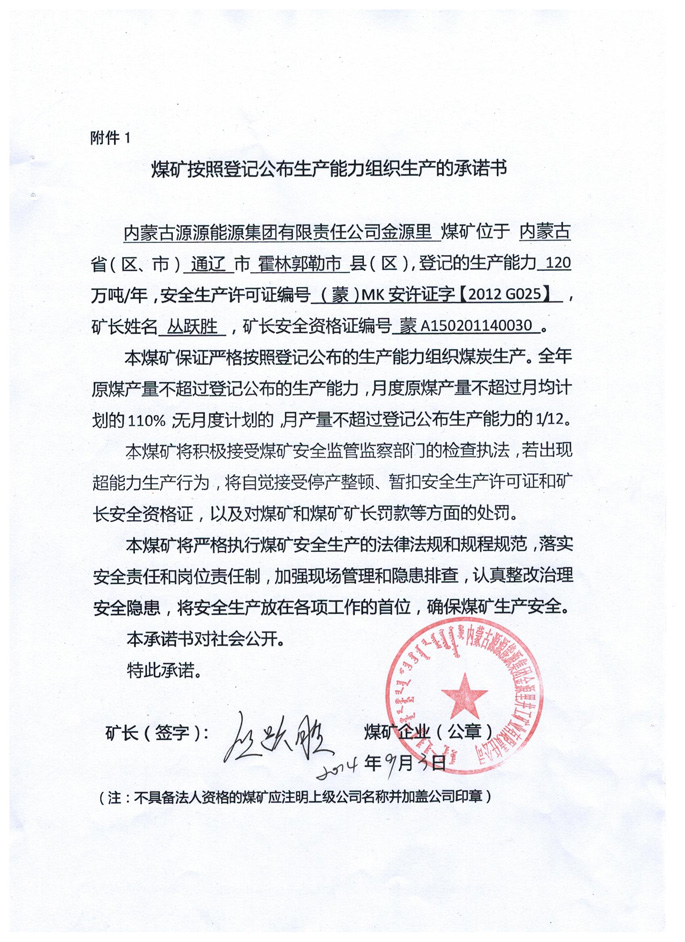内蒙古源源能源集团有限责任公司金源里煤矿生产承诺书