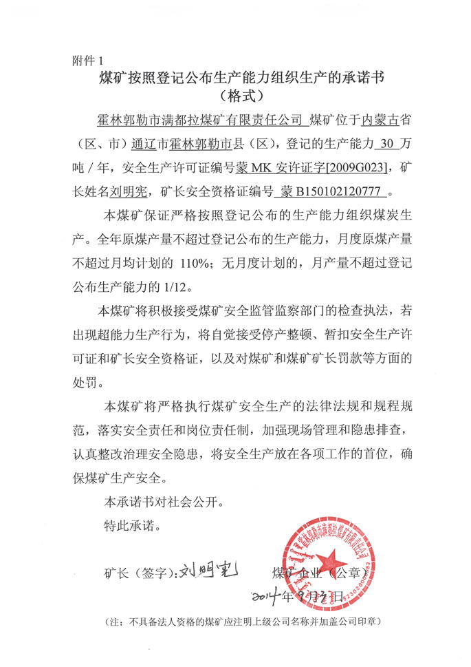 霍林郭勒市满都拉煤矿有限责任公司煤矿生产承诺书
