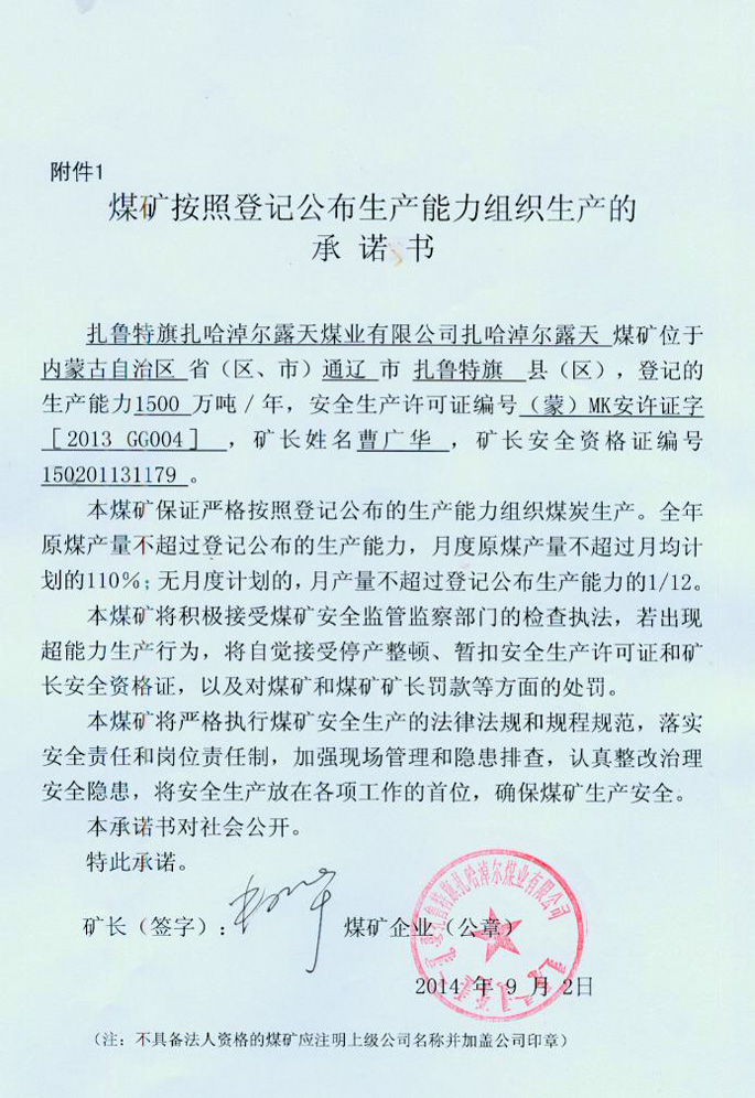 扎鲁特旗扎哈淖尔煤业有限公司扎哈淖尔露天煤矿生产承诺书