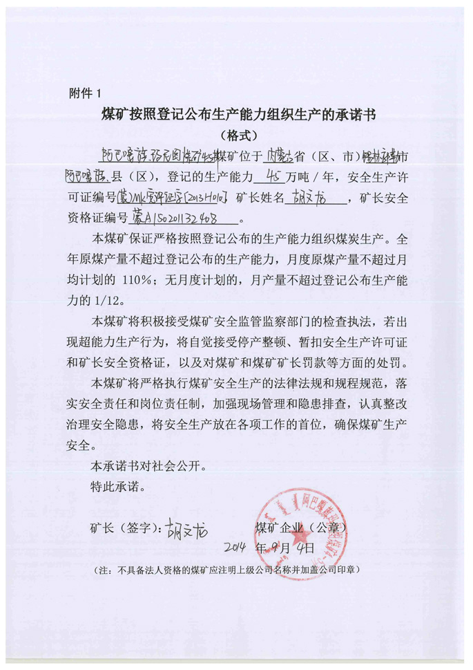 阿巴嘎旗玛尼图煤矿4-5井生产承诺书