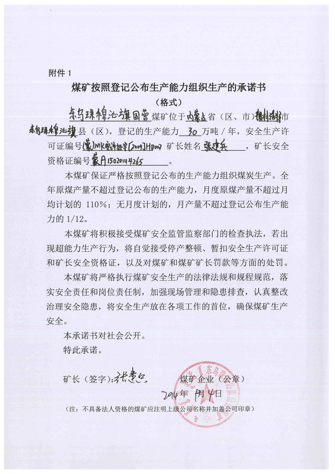 东乌珠穆沁旗国营煤矿生产承诺书