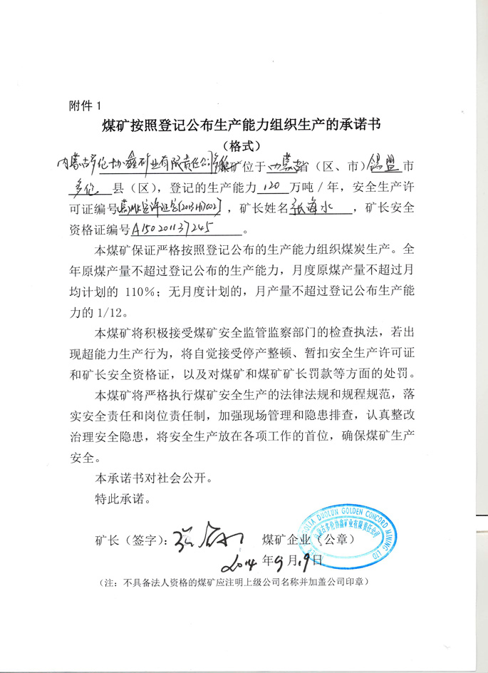 内蒙古多伦协鑫矿业有限责任公司多伦矿生产承诺书