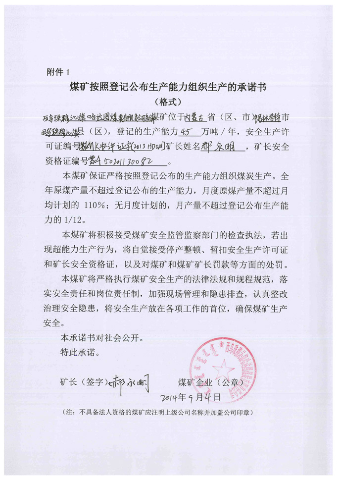 西乌珠穆沁旗哈达图煤炭有限责任公司新井生产承诺书