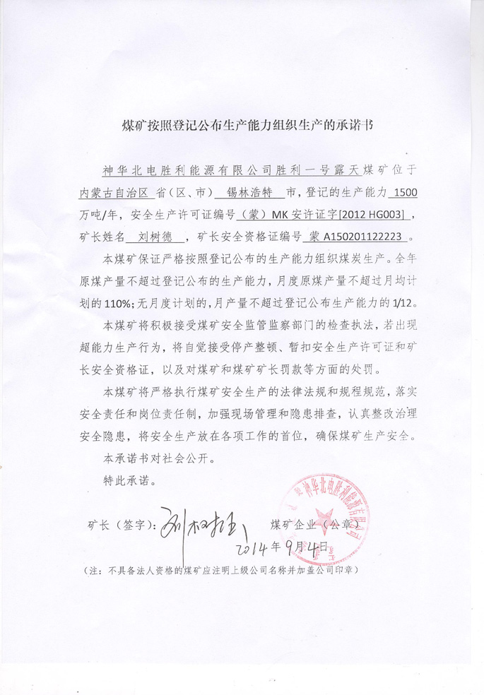 中国神华能源股份有限公司胜利一号露天矿生产承诺书