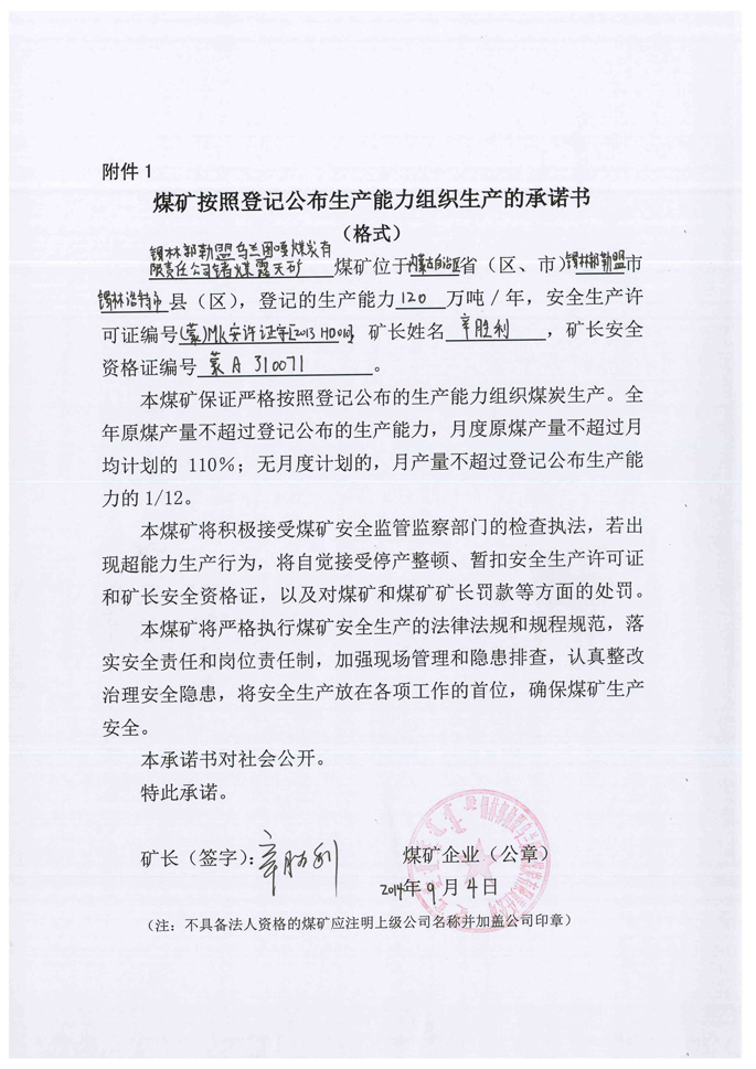 锡林郭勒盟乌兰图嘎煤炭有限责任公司锗煤露天矿生产承诺书