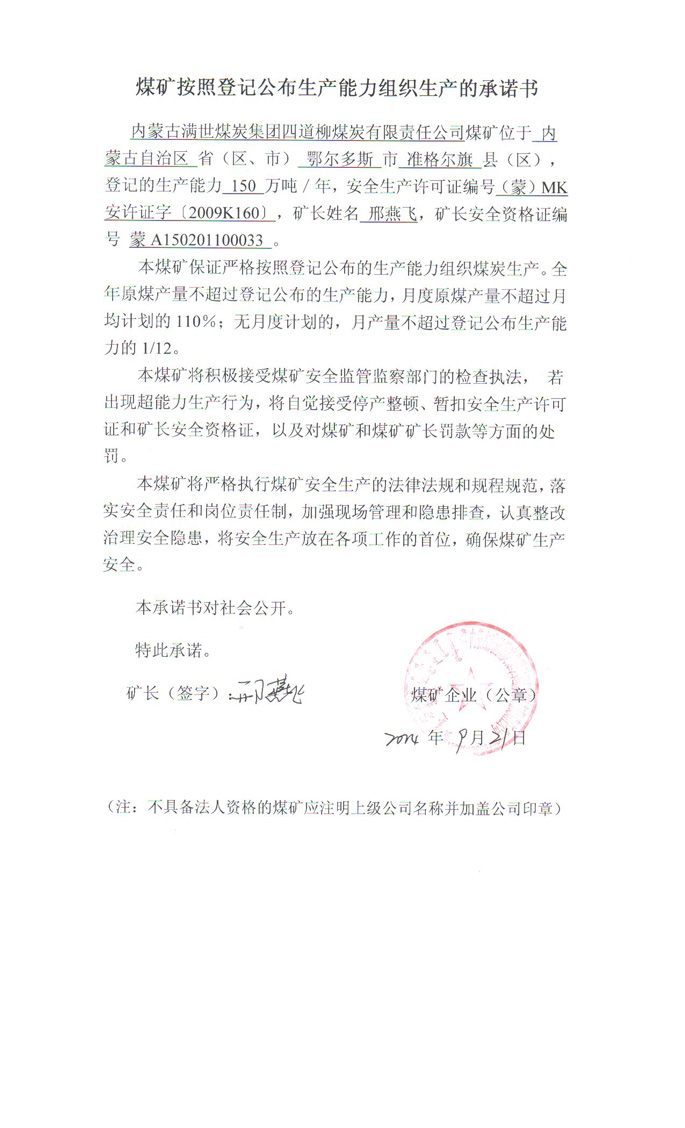 内蒙古满世煤炭集团四道柳煤炭有限责任公司煤矿生产承诺书