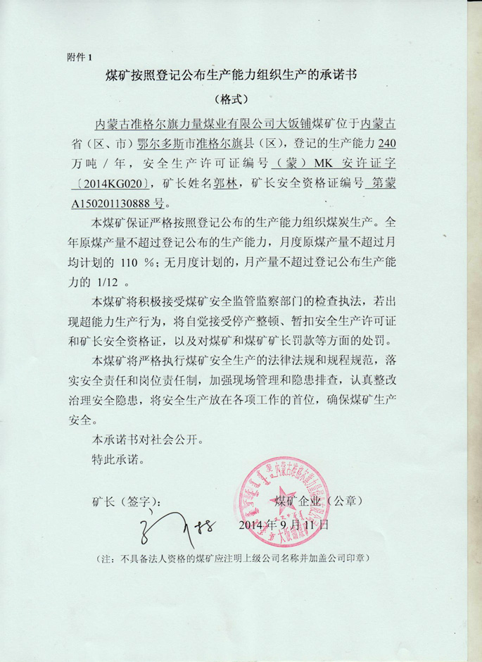 内蒙古准格尔旗力量煤业有限公司大饭铺煤矿生产承诺书
