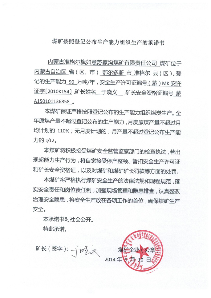 内蒙古准格尔旗如意苏家沟煤矿有限责任公司生产承诺书