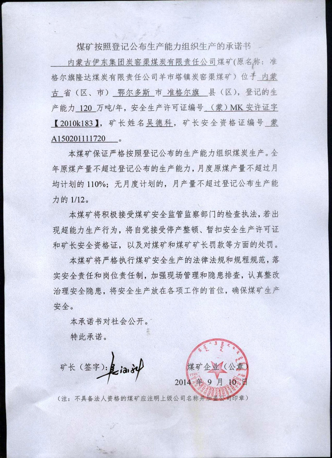 准格尔旗隆达煤炭有限责任公司羊市塔镇炭窑渠煤矿生产承诺书