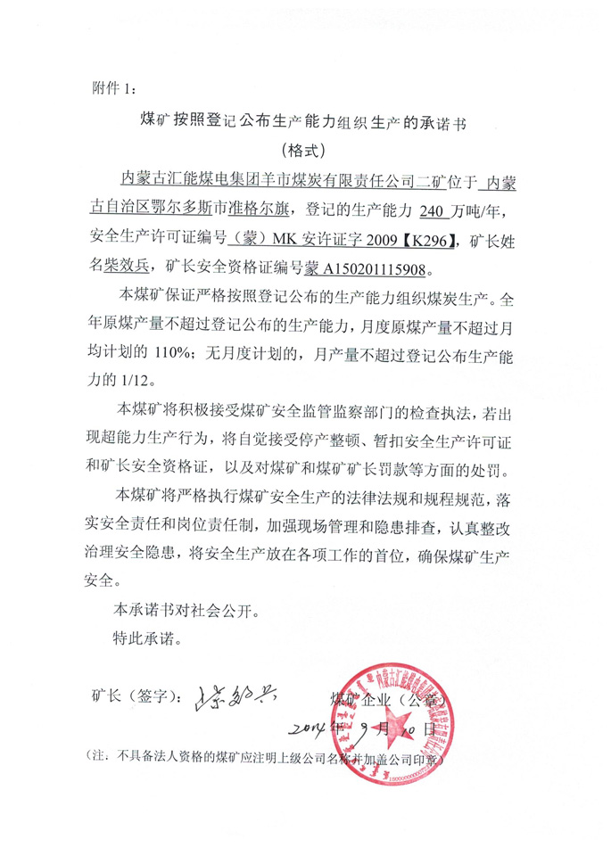 内蒙古汇能煤电集团羊市塔煤炭有限责任公司二矿生产承诺书
