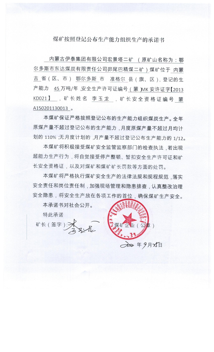 鄂尔多斯市东达煤炭有限责任公司峁尾巴精煤二矿生产承诺书