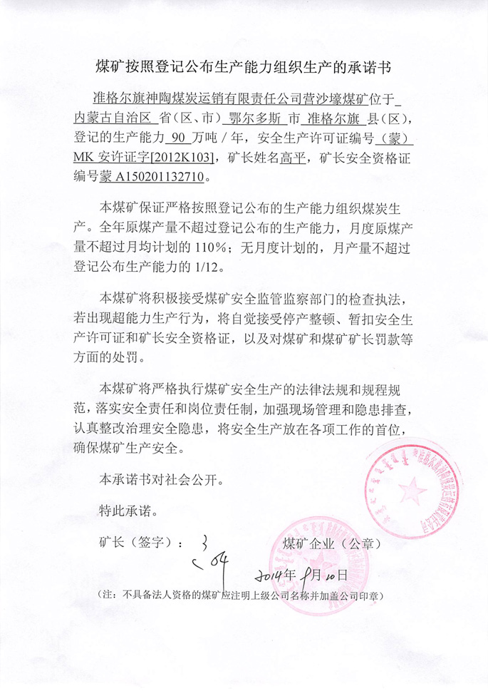 准格尔旗神陶煤炭运销有限责任公司营沙壕煤矿生产承诺书